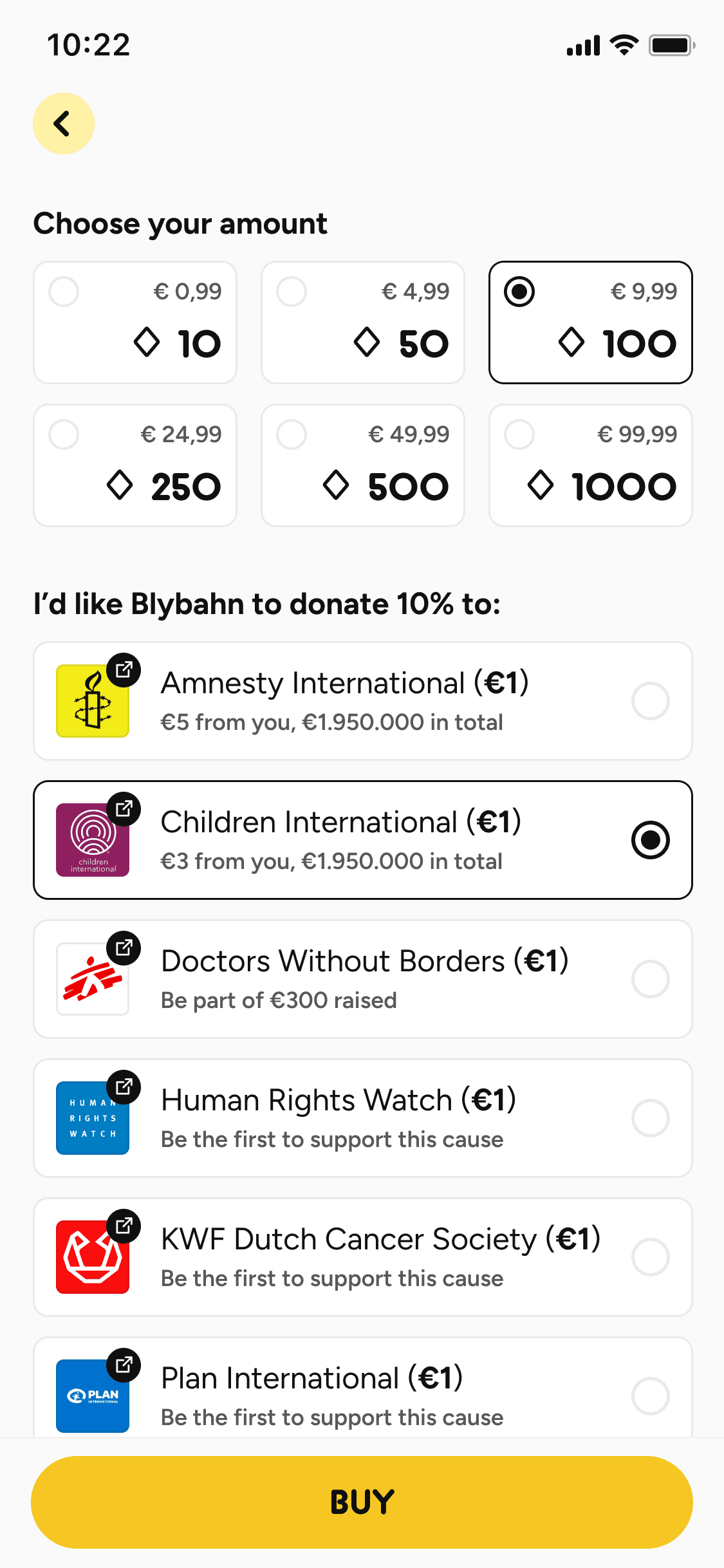 Blybahn is free to use, but you can choose to give more by buying ‘Diamonds’. 10% of every purchase goes directly to a charity you care about. Together, we turn appreciation into real social impact.