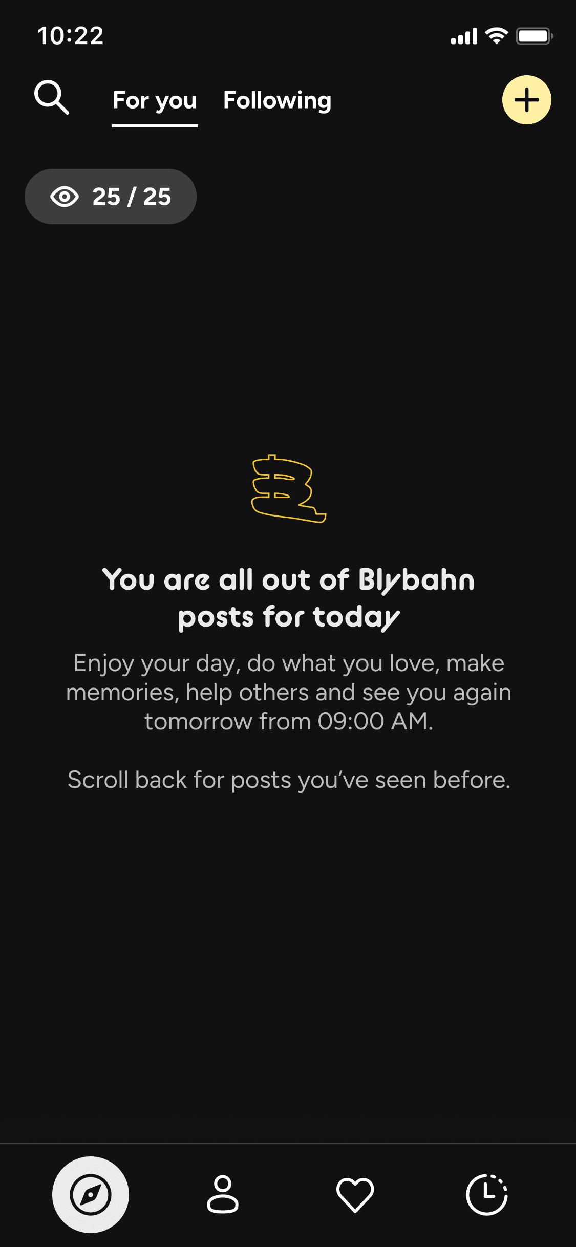 Blybahn protects your time by replacing the infinite scroll with a feed that actually ends. With just one post per day, you can catch up quickly and check out of the noise. When you're done, you're done: time to get back to real life.