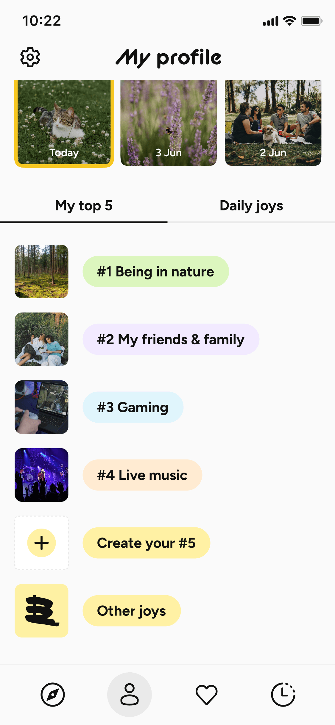 Share your ‘Top 5’; from hobbies and passions to the people you love. Refine them over time to create a personal picture of your life. No quick updates that disappear, but a profile built on what truly matters.